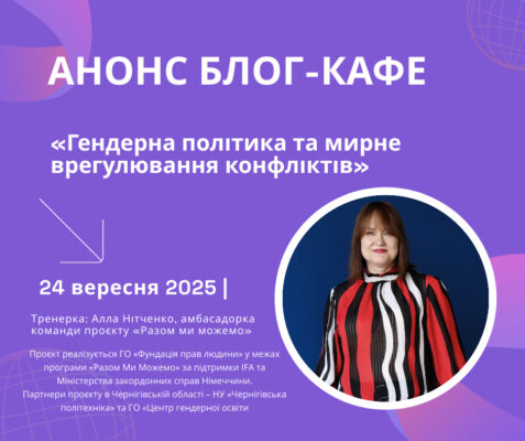 ГО “Центр гендерної освіти” спільно з кафедрою філософії і суспільних наук НУ “Чернігівська політехніка” 10 вересня 2025 р. запрошує студентів, викладачів, представників громадських організацій та активних мешканців громад взяти участь у блог-кафе, присвяченому темі ненасильницького спілкування та діалогу як важливого інструменту розбудови довіри та співпраці. Мета заходу: обговорити практичні методики ефективного діалогу, напрацювати навички вирішення […]